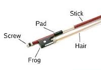 Don't touch the bow hair with your fingers or it will get dirty. Always loosen the bow when not in use. If you do not loosen your bow, the tension will cause the stick to warp over time. When loosened, the hair should touch the stick. Do not loosen so much that the screw becomes loose, however. Do not over-tighten your bow. The stick should never be so tight that it is straight or curved away from the hair.
